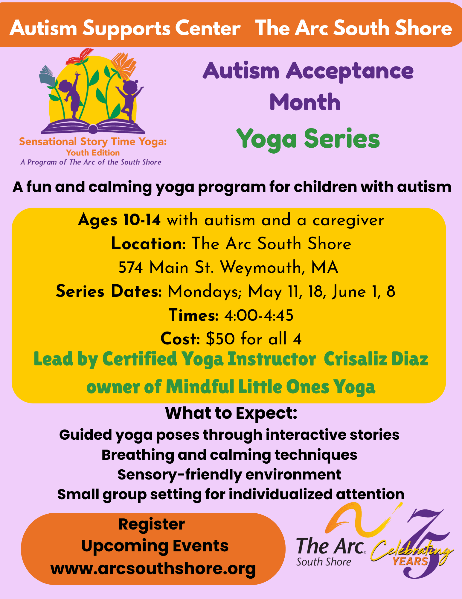 Join us as we continue to celebrate Autism Acceptance Month and Introduce our New Storytime Yoga Youth Edition for ages 10-14. A caregiver is required to attend and always welcome to join in! This program will be lead by Crisaliz Diaz who is a certified yoga instructor and the owner of Mindful Little Ones Yoga. It is a 4-week program held on Monday nights beginning on 5/11/2026-6/8/2026. The classes will be held at 574 Main St, Weymouth from 4:00-4:45pm. The cost will be $50 for the full series of 4 classes. Come join us and enjoy the benefits: • Improves focus and attention